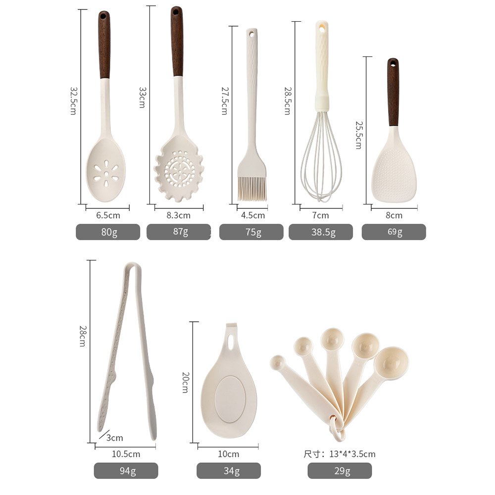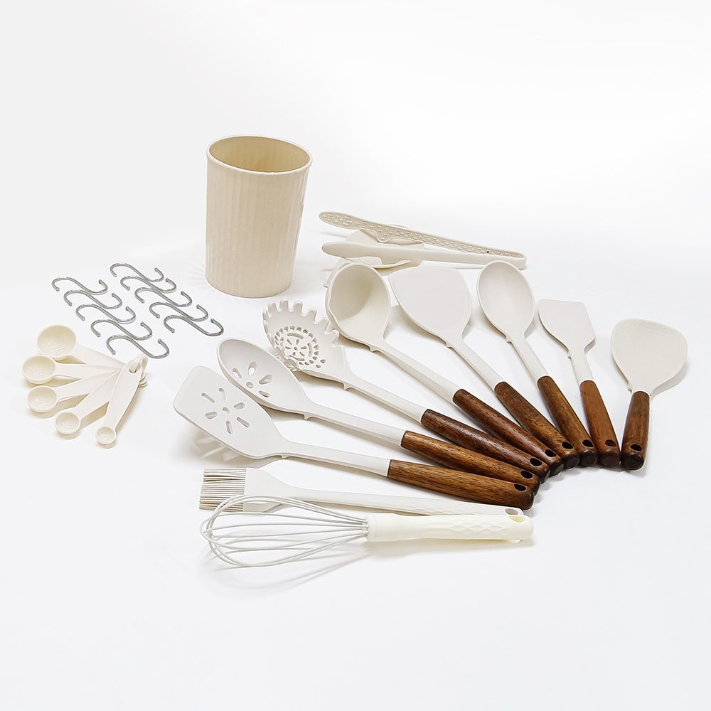 This 28-piece set is thoughtfully curated to cover all your culinary needs, including a variety of spoons, turners, whisks, and measuring spoons. Additionally, it features a spoon rest to keep your counters clean and a stylish holder for easy storage. Each piece is designed for practical everyday use, ensuring you have the right tool for every task, whether you’re baking, frying, mixing, or serving.