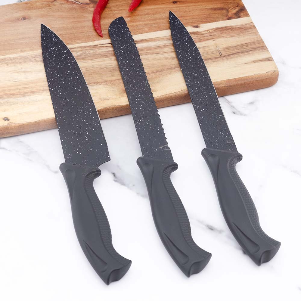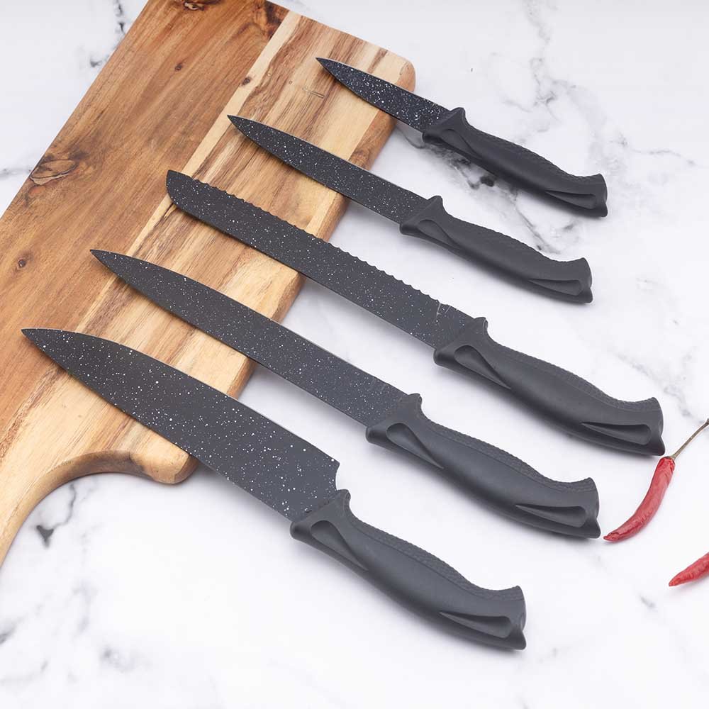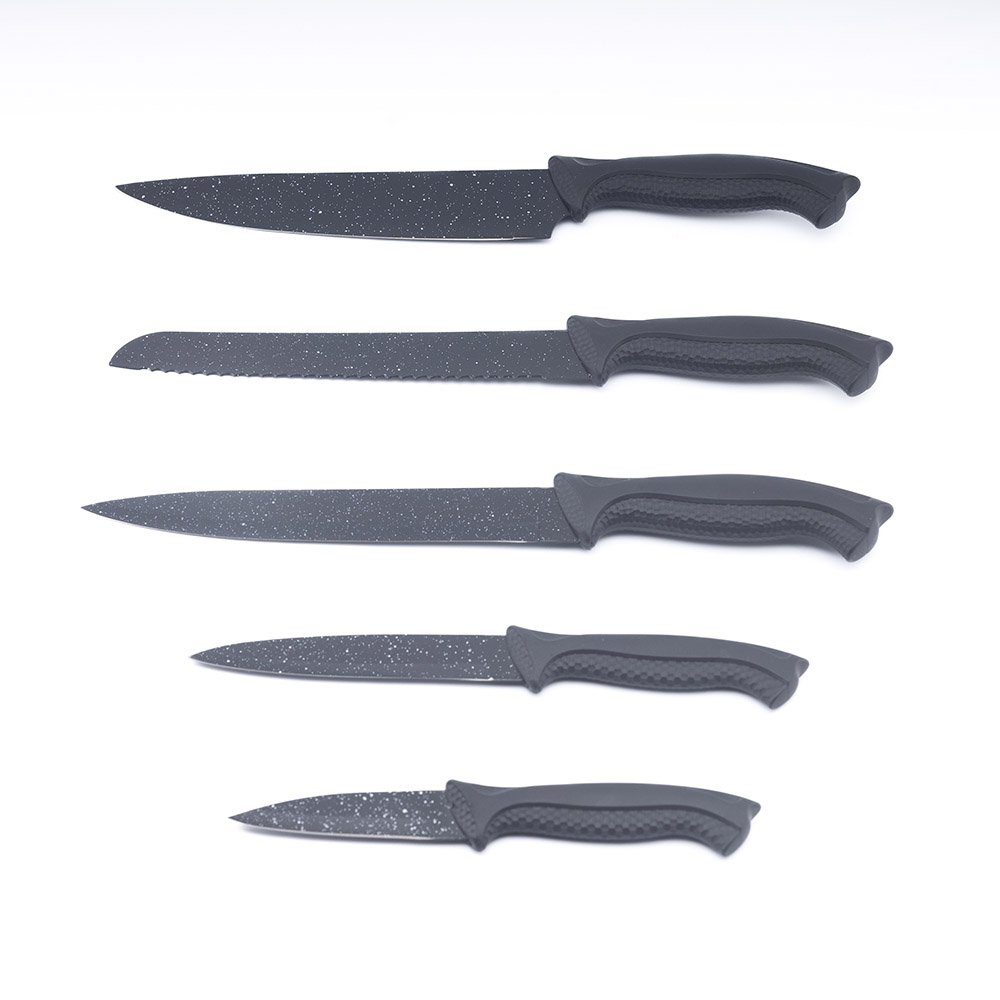 MOQ:3000 sets of 6-Piece Black Stainless Steel Knife Set with Universal Storage Block & Non-Slip Base