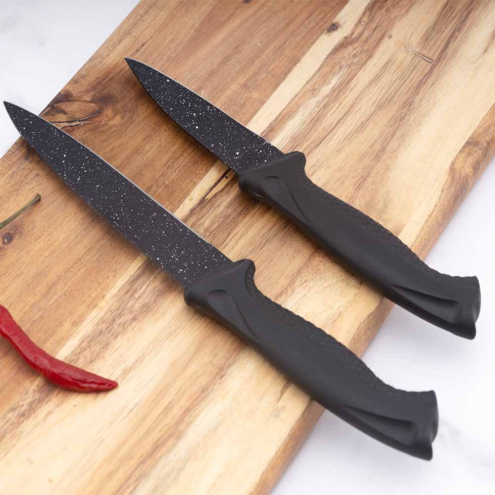 • Sharp, Durable Black Blades:‌ Each knife features a precision-crafted stainless steel blade with a sleek ‌black coating‌. This not only provides a modern, unified look but also enhances stain resistance. The blades are exceptionally sharp right out of the box for effortless slicing, dicing, and chopping.