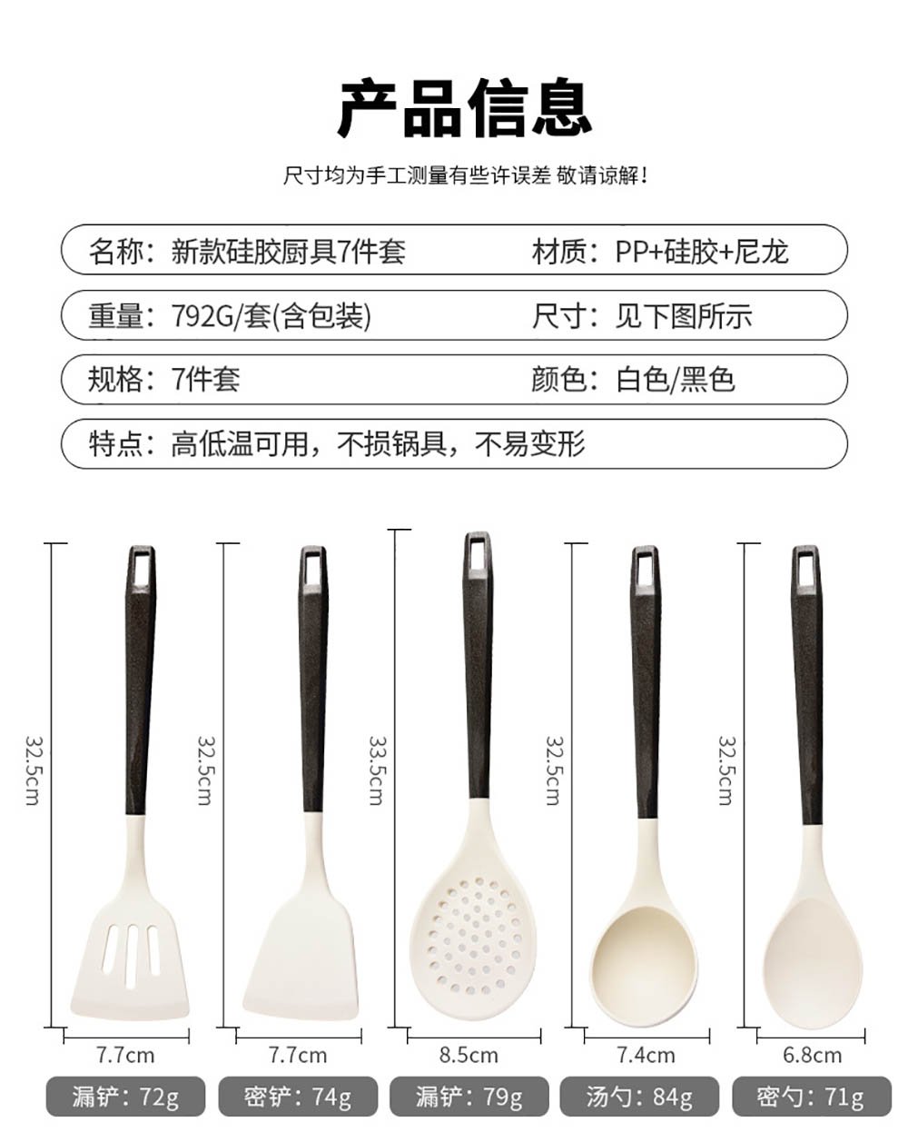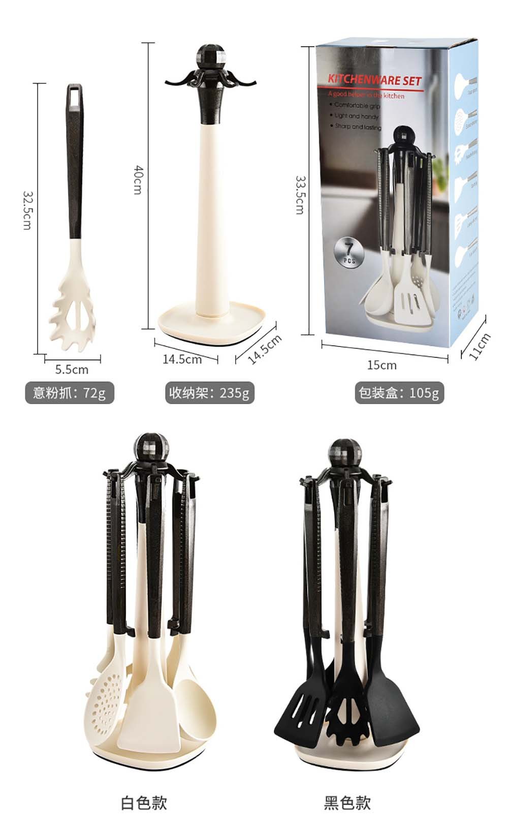 - Two Stylish Color Options: Choose a look that matches your kitchen aesthetic. Both sets feature sleek matte-black handles, paired with your choice of a classic White or a modern Black silicone head.