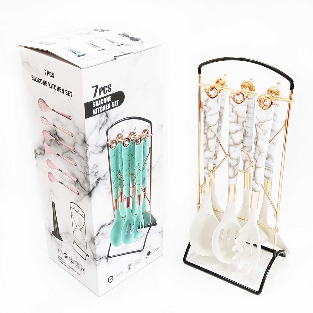 - Set Includes (7 Pieces Total): 1 Solid Turner, 1 Ladle, 1 Solid Spoon, 1 Slotted Spoon, 1 Pasta Server, 1 Skimmer, and 1 Hanging Storage Rack.