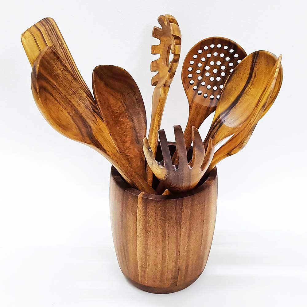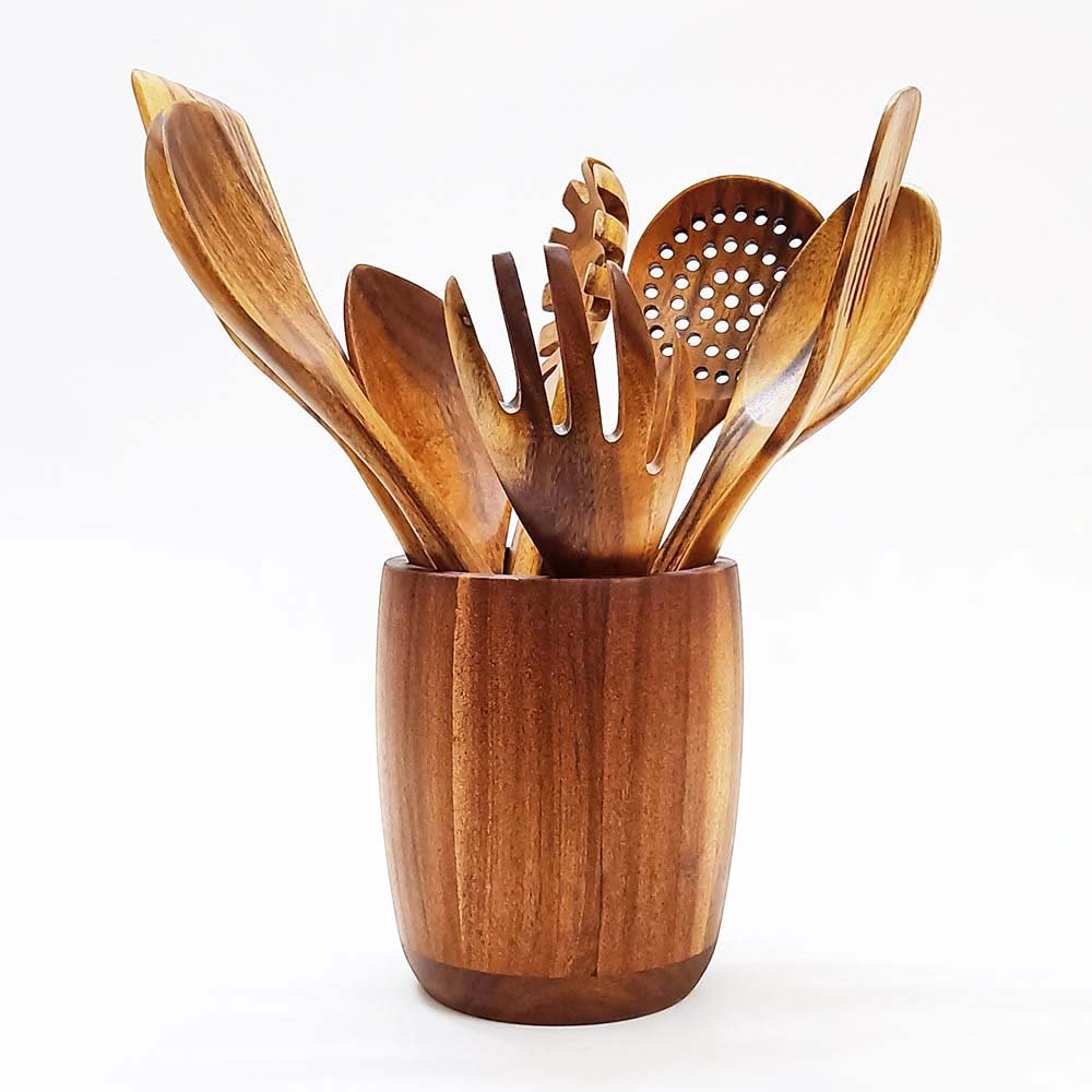 Embrace Natural Elegance and Wholesome Cooking with Our Handcrafted 9-Piece Acacia Wooden Utensil Set with Round Storage Holder.