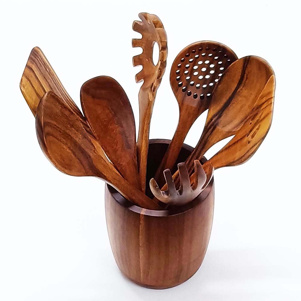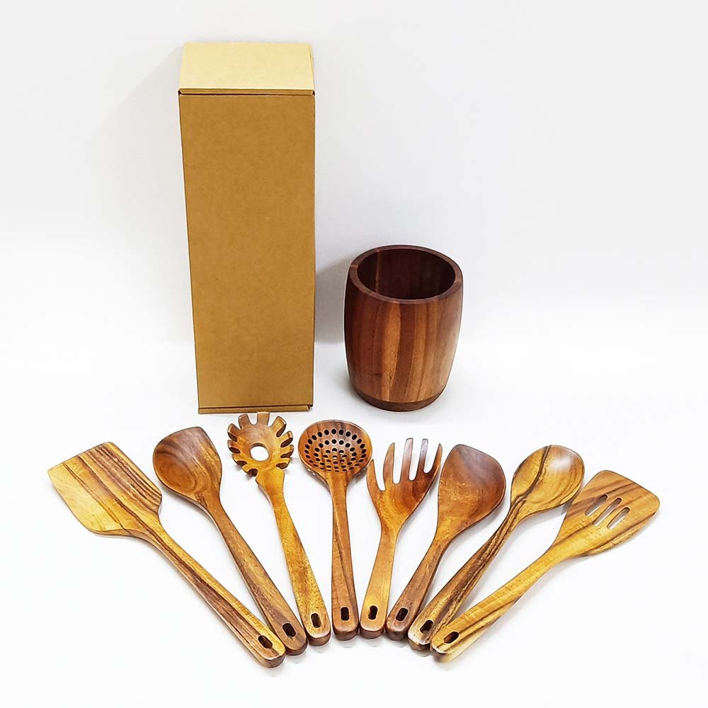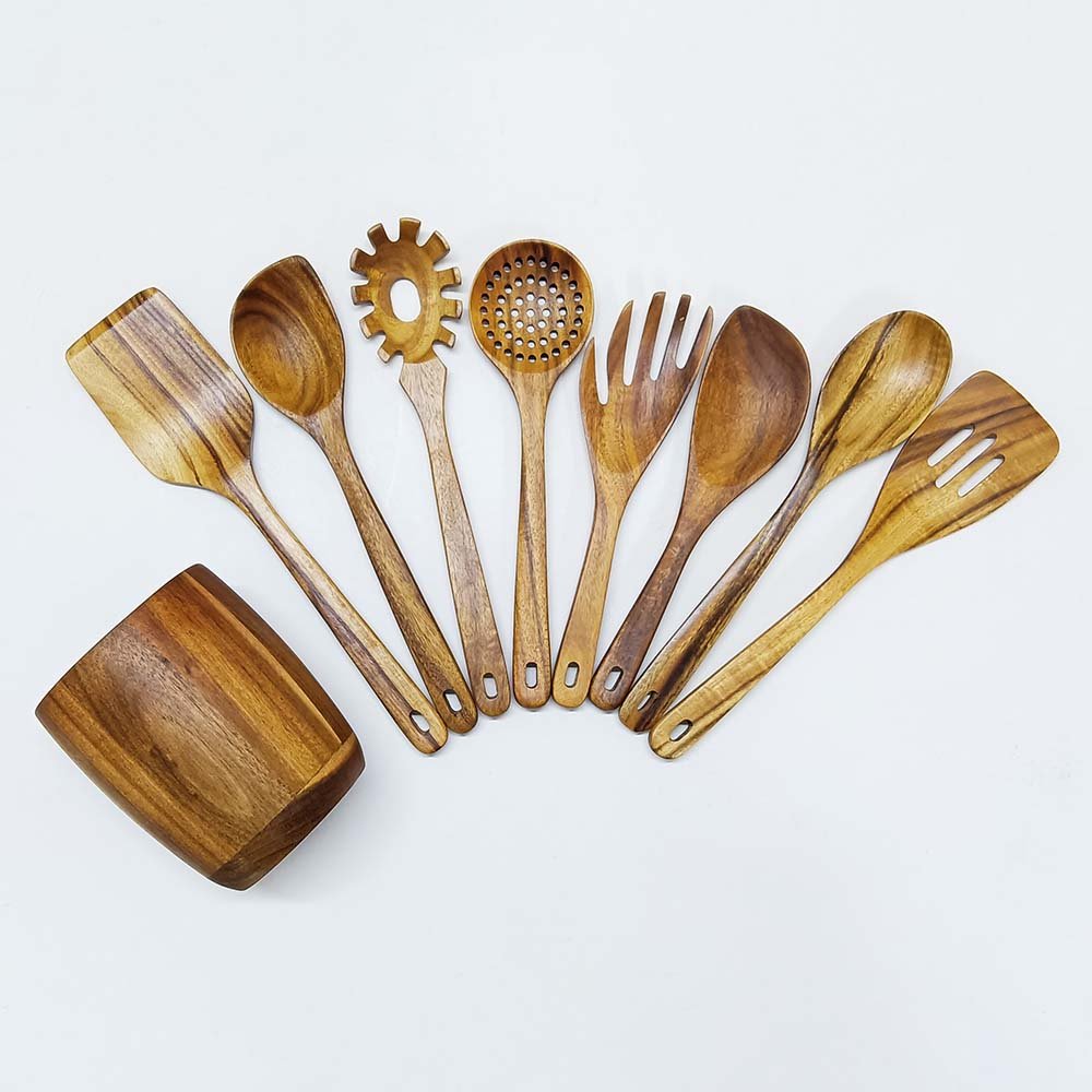 - Set Includes (9 Pieces): 1 Solid Turner, 1 Slotted Turner, 1 Solid Spoon, 1 Salad Spoon, 1 Salad Fork, 1 Skimmer, 1 Spaghetti Spoon, 1 Scraper Spatula, 1 Round Wooden Storage Holder.