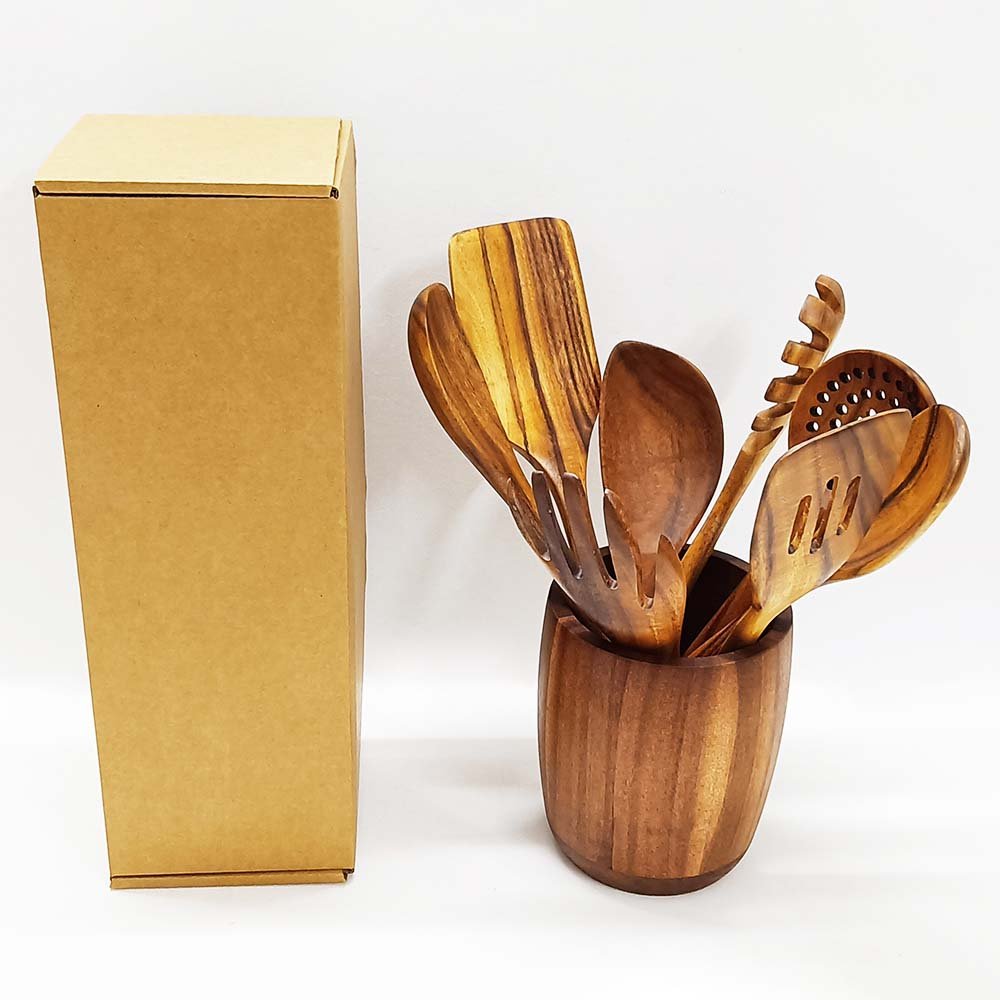 9-Piece Acacia Wooden Utensil Set with Round Storage Holder – Transform your kitchen into a haven of rustic charm and healthy culinary practice. This exquisite 9-Piece Acacia Wooden Utensil Set combines timeless functionality with the warm, organic beauty of nature. Meticulously hand-sanded and finished with a plant-based lacquer, each piece is not just a tool, but a unique work of art, designed to make cooking a more sensory and joyful experience. Presented in a beautiful round wooden holder, it’s the perfect gift that organizes, inspires, and elevates.