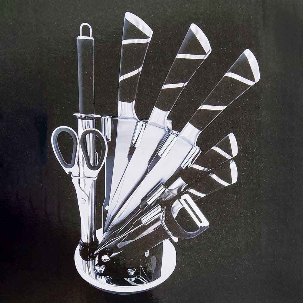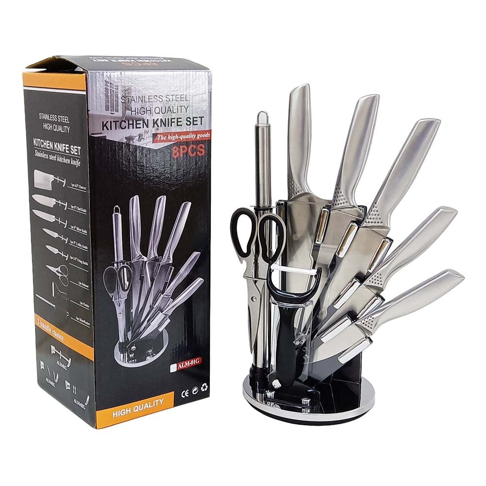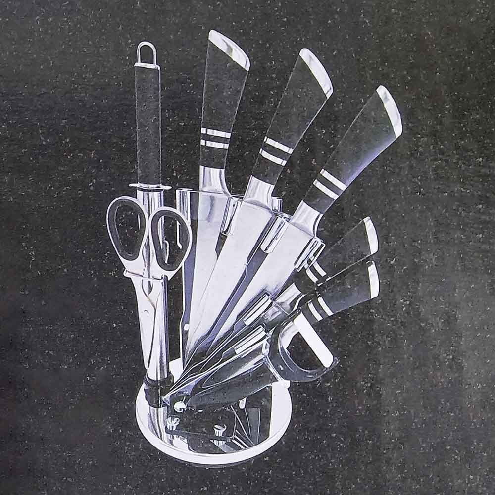 9-Piece Stainless Steel Kitchen Knife Set with 360 Rotating Block – The Chef’s Choice 9-Piece Stainless Steel Kitchen Knife Set is everything a modern home cook needs for an elevated cooking experience. This comprehensive set includes a versatile selection of knives and tools that are crafted to deliver precision, efficiency, and durability, all housed in a 360° rotating block for convenient storage and accessibility. With stylish stainless steel construction, this set stands out for both performance and aesthetics, making it an indispensable addition to your kitchen.