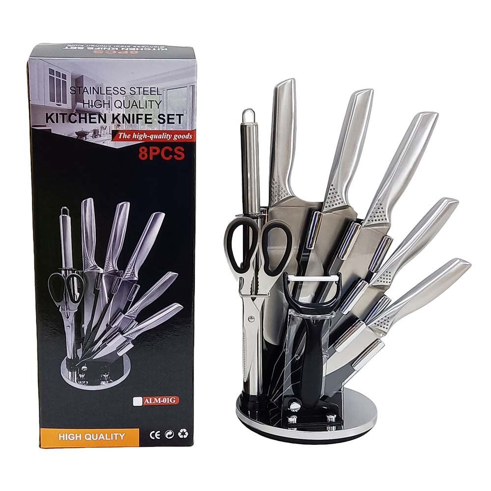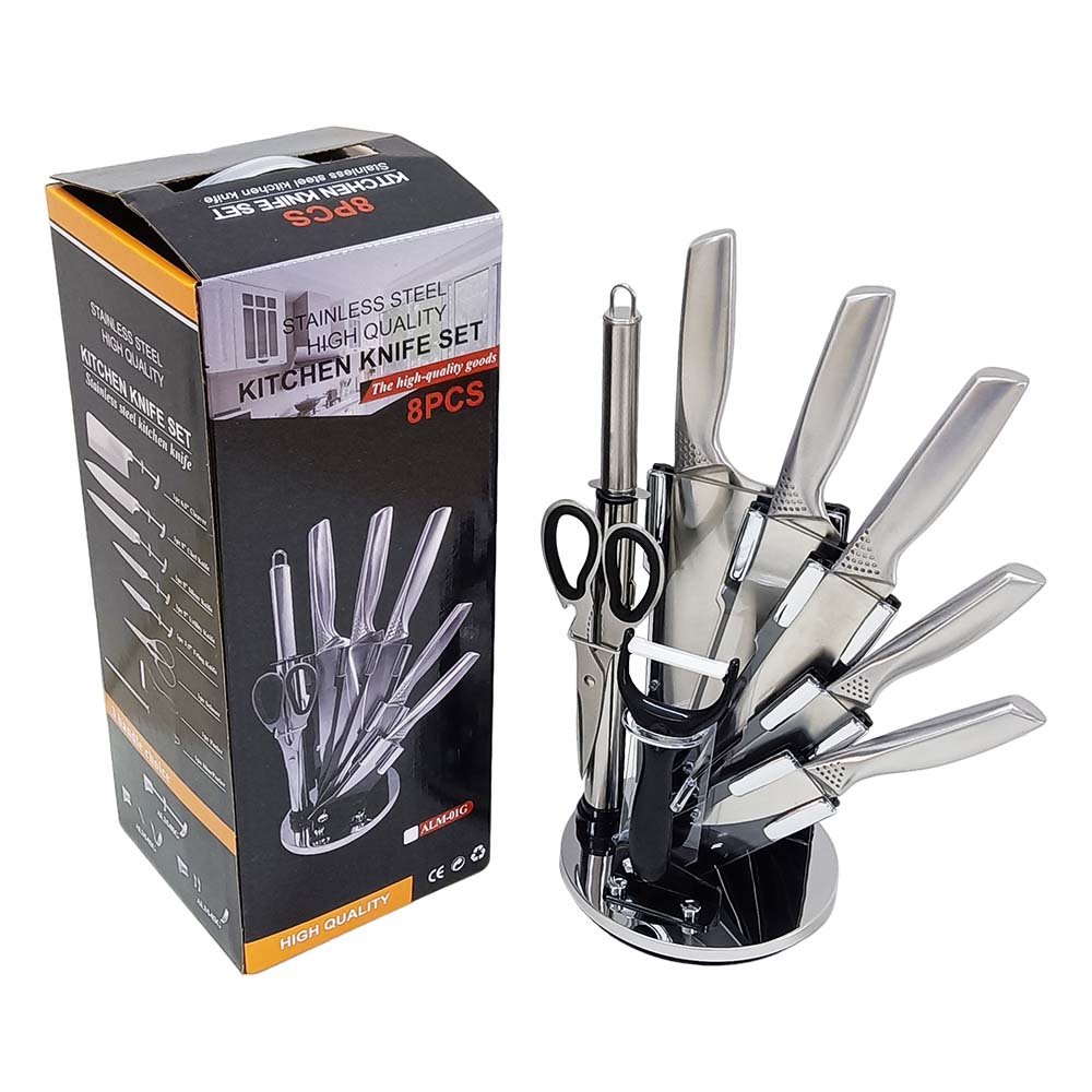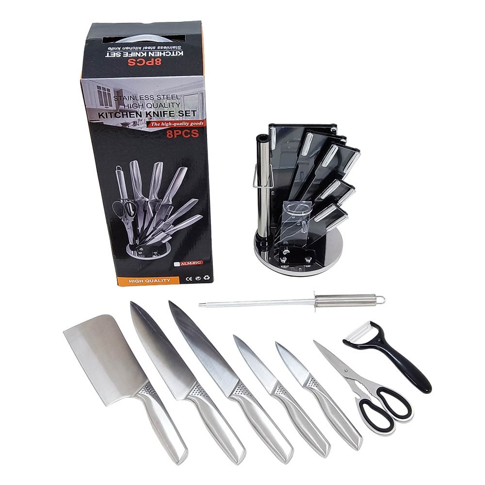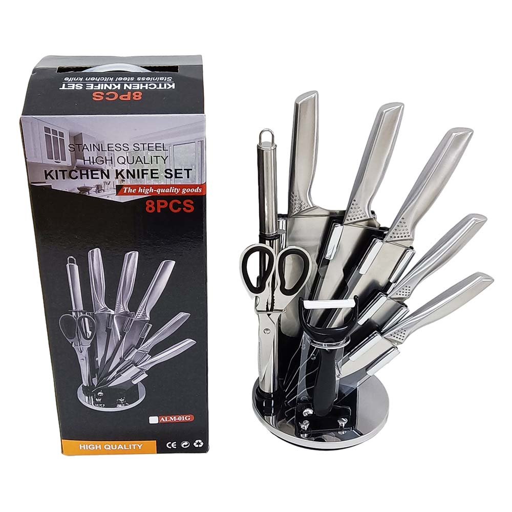 9-Piece Stainless Steel Kitchen Knife Set with 360 Rotating Block – The Chef’s Choice 9-Piece Stainless Steel Kitchen Knife Set is everything a modern home cook needs for an elevated cooking experience. This comprehensive set includes a versatile selection of knives and tools that are crafted to deliver precision, efficiency, and durability, all housed in a 360° rotating block for convenient storage and accessibility. With stylish stainless steel construction, this set stands out for both performance and aesthetics, making it an indispensable addition to your kitchen.