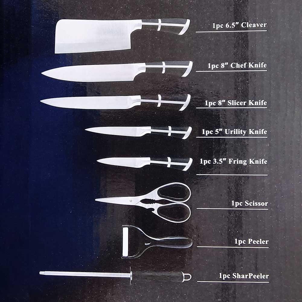 Chef’s Choice 9-Piece Stainless Steel Kitchen Knife Set with 360 Rotating Block Sharp Kitchen Knives Comfortable Grip 1pc 6.5″ Cleaver 1pc 8″ Chef Knife 1pc 8″ Slicer Knife 1pc 5″ Utility Knife 1pc 3.5″ Paring Knife 1pc Scissor 1pc Peeler 1pc Sharpener