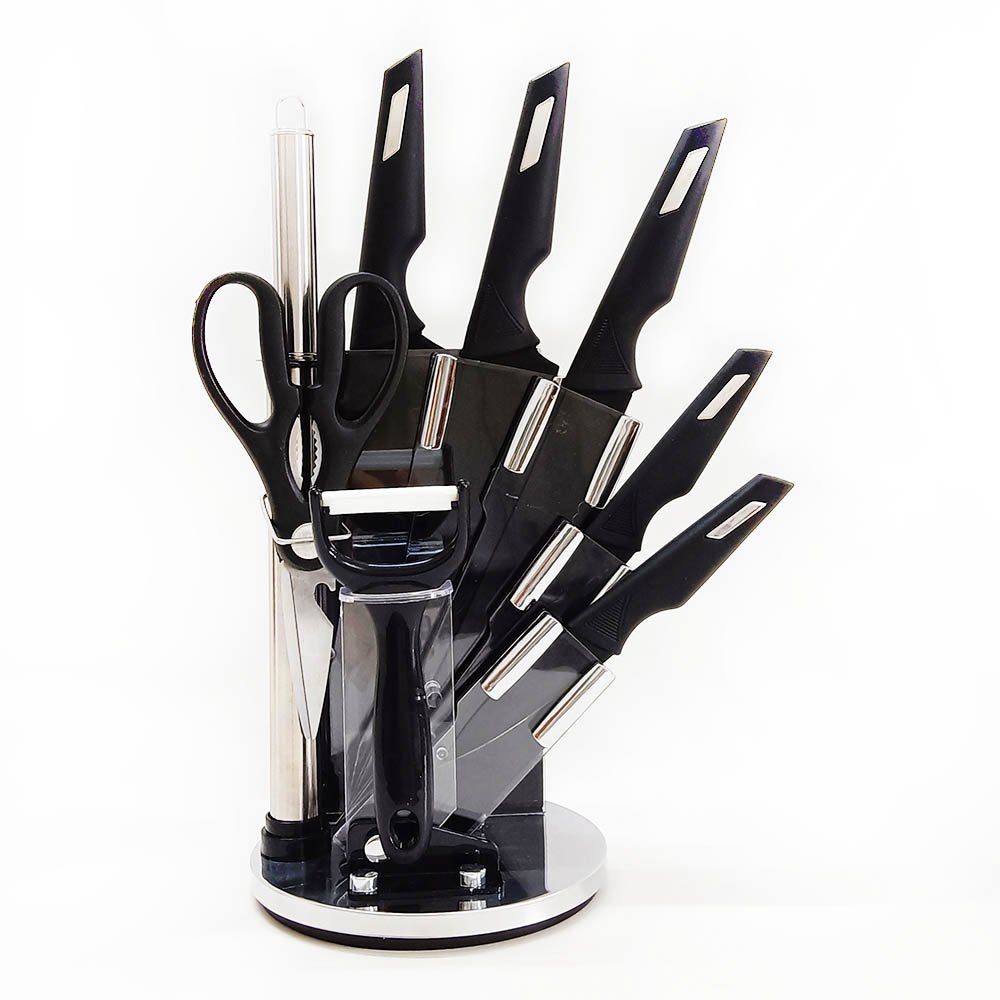 MOQ:500 sets of 9-Piece Stainless Steel Knife Set with Rotating Acrylic Stand – Includes Sharpener, Scissors, Peeler for Complete Kitchen Solution