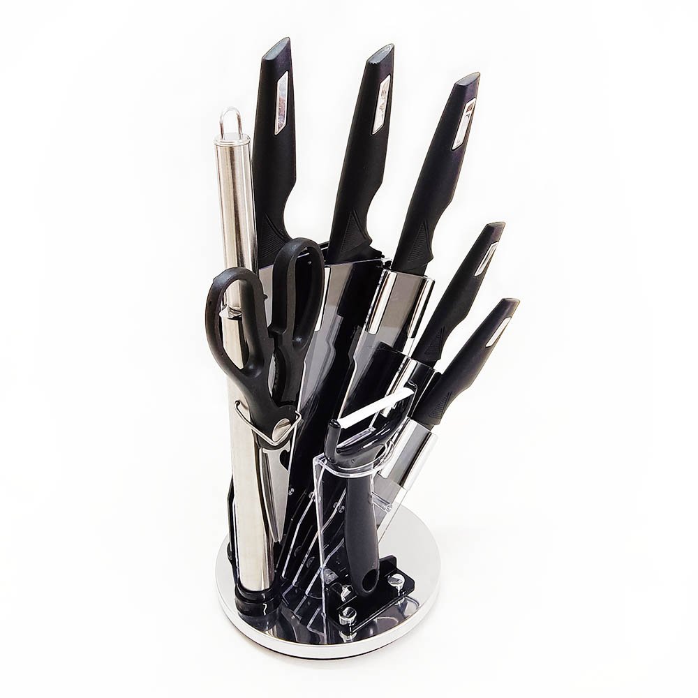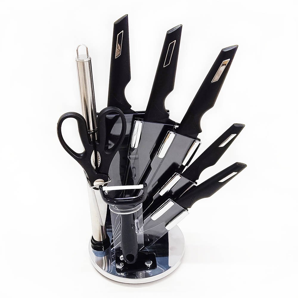 9-Piece Stainless Steel Knife Set with Rotating Acrylic Stand – This comprehensive 9-piece stainless steel knife set combines professional-grade cutting performance with elegant, space-saving storage. Designed for both home cooks and culinary enthusiasts, the set includes essential knives, tools, and a unique rotating acrylic stand to keep your kitchen organized and efficient.