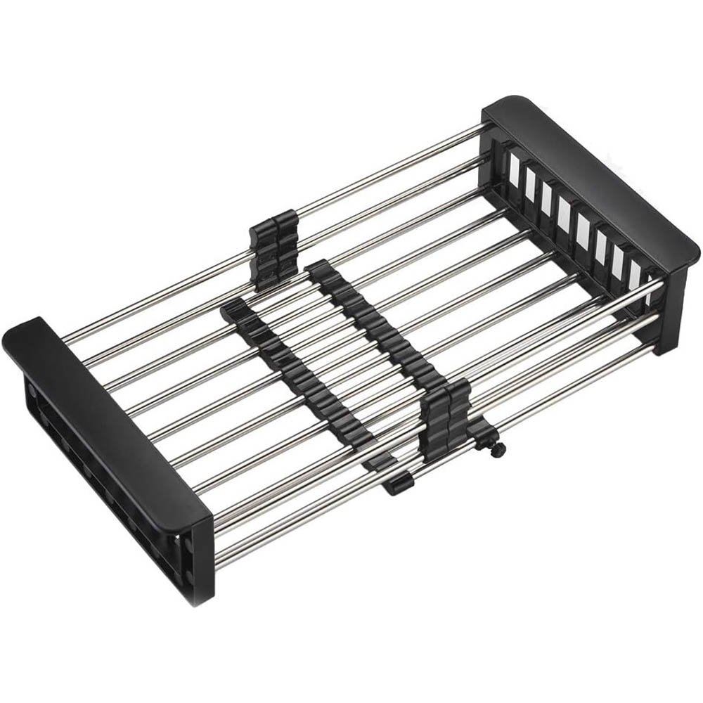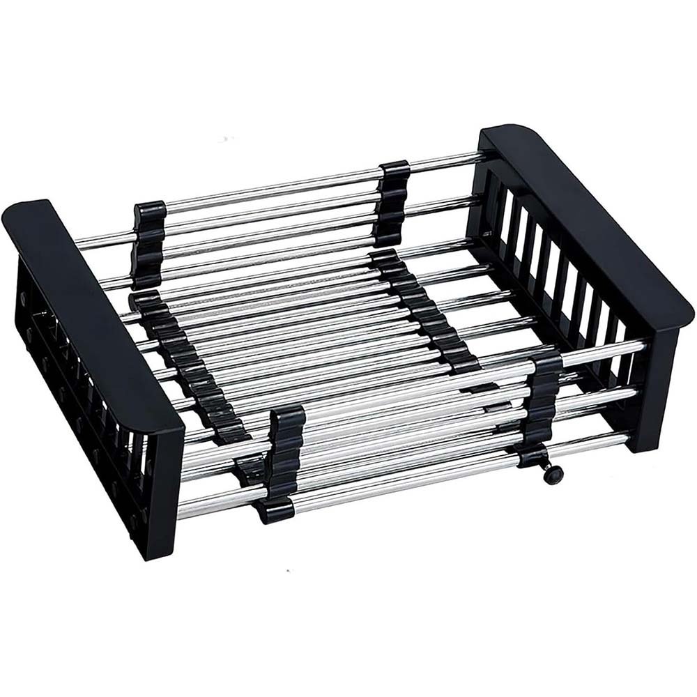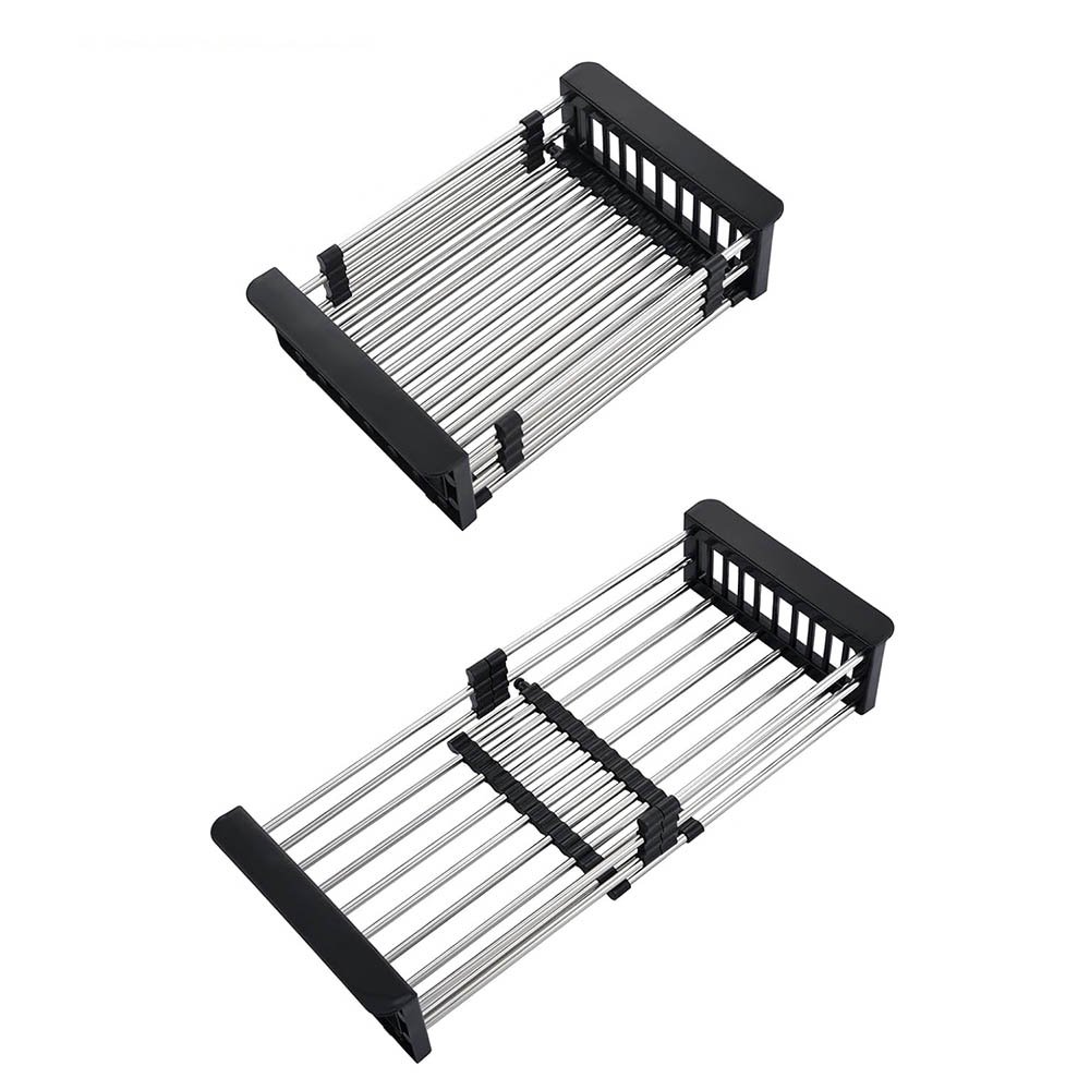 - Fully Adjustable & Retractable Design: The telescopic rods allow you to freely adjust the length of the drainage basket to fit your specific sink or counter space. The locking screws securely fix the chosen length, preventing slippage and ensuring a stable platform for all your kitchen tools.