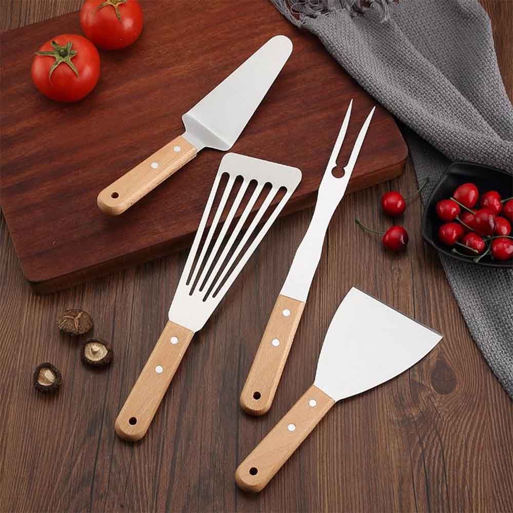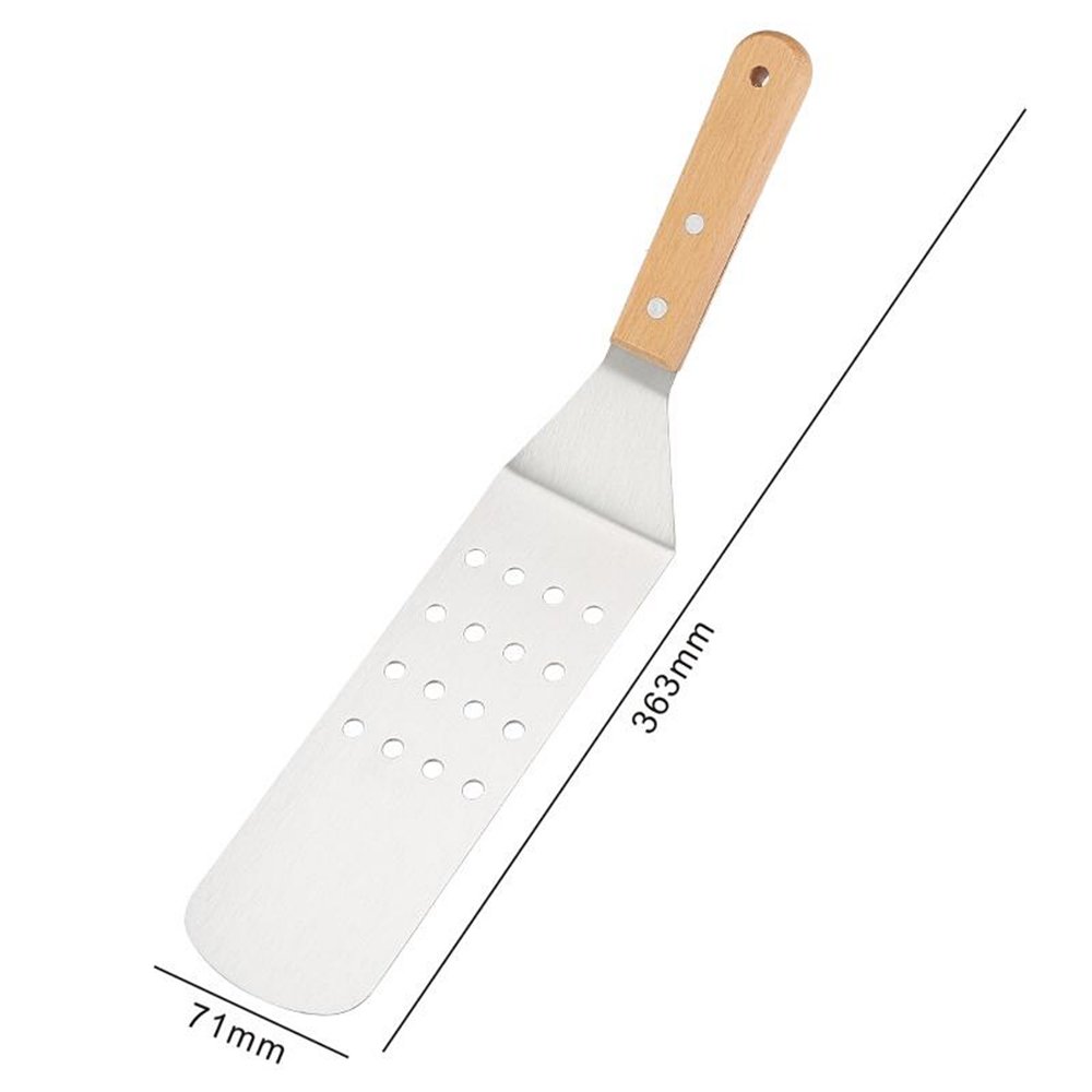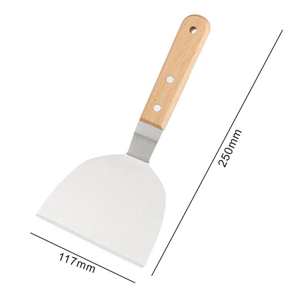 This comprehensive spatula set includes everything you need to master your barbecue skills. Engineered with precision, the flat griddle spatulas are perfect for evenly flipping and turning burgers, veggies, and sandwiches. The practical scraper tool ensures effortless removal of residue and stuck-on food, leaving your grilling surface spotless and perfectly ready for the next round of cooking. Its sturdy, ergonomic wooden handle provides a comfortable grip and unparalleled control, allowing you to cook with ease and efficiency.