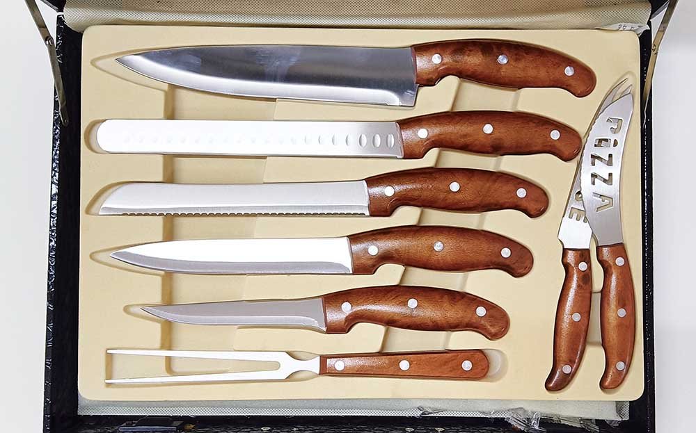 Core Knives: 1x 8.5″ Chef’s Knife (2.3mm), 1x 8.5″ Ham Knife (1.5mm), 1x 7.5″ Bread Knife (1.8mm), 1x 7″ Slicing Knife (1.8mm), 1x 5″ Boning Knife (1.8mm).