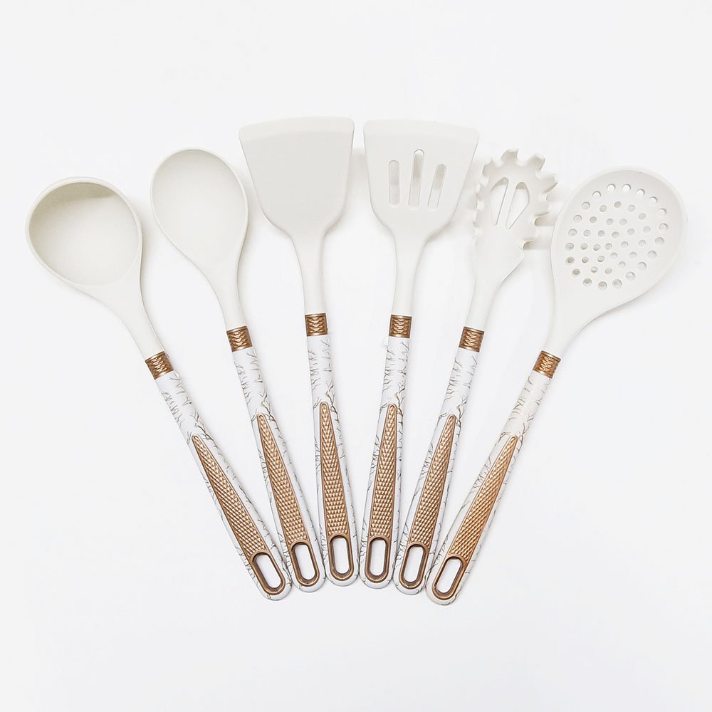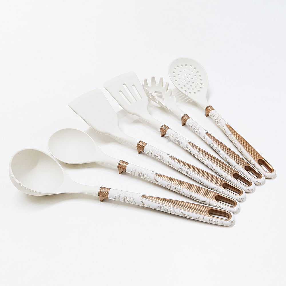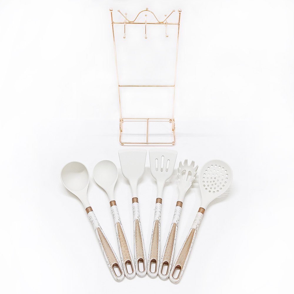 Luxury 7-Piece Silicone Utensil Set with Hanging Shelf – Elevate your culinary space with this sophisticated 7-piece silicone utensil set, designed for those who refuse to compromise between style, function, and cookware care. This “Luxury” collection goes beyond basic tools, featuring a curated selection of six essential utensils crafted from high-temperature resistant silicone, each paired with an ergonomic dual-textured handle (diamond grip + stone-patterned overmold). The included sleek wall-mount hanging shelf provides an elegant, space-saving storage solution, turning functional tools into a display of modern kitchen organization. Available in timeless White or minimalist Black.