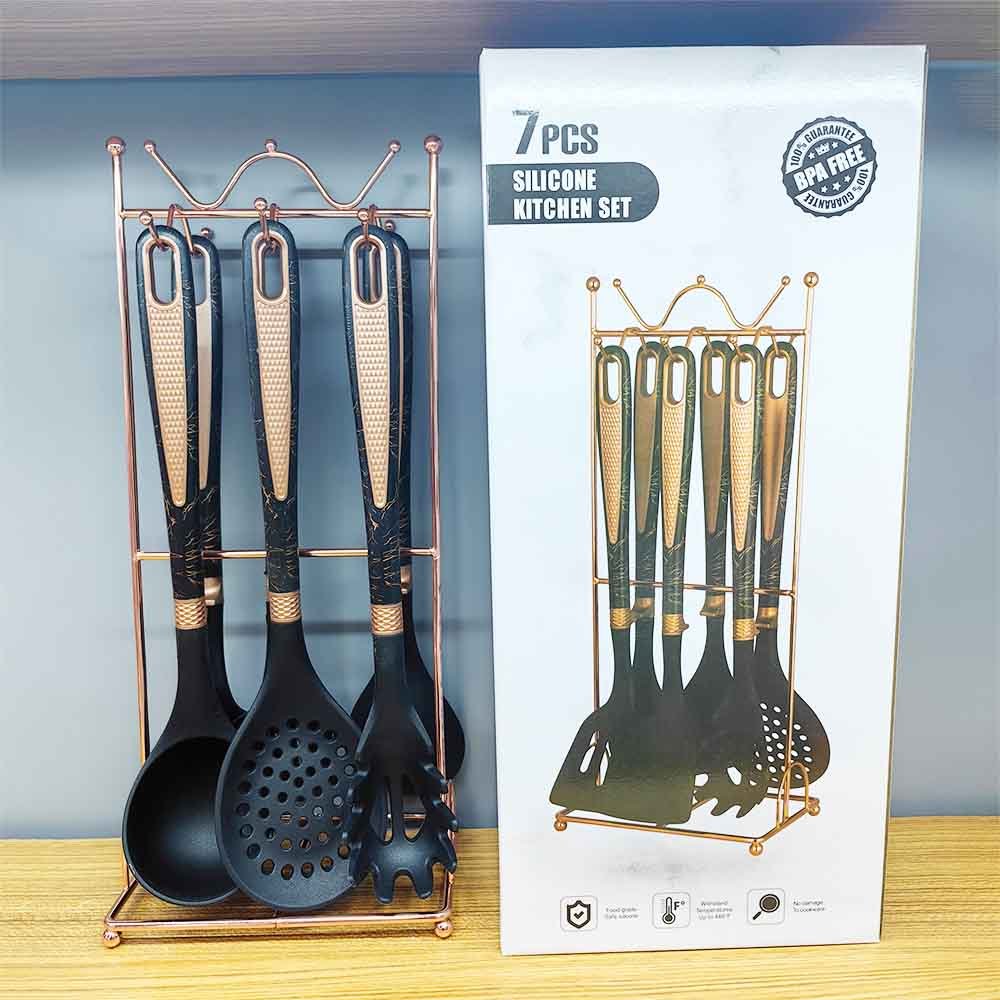 Luxury 7-Piece Premium Silicone Kitchen Utensil Set with Wall-Mount Hanging Shelf – Non-Scratch, Heat-Resistant Tools for Home & Restaurant