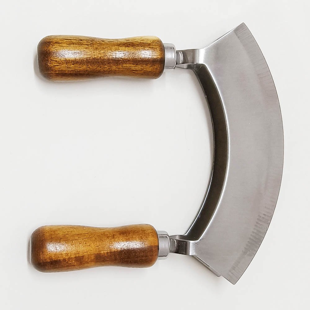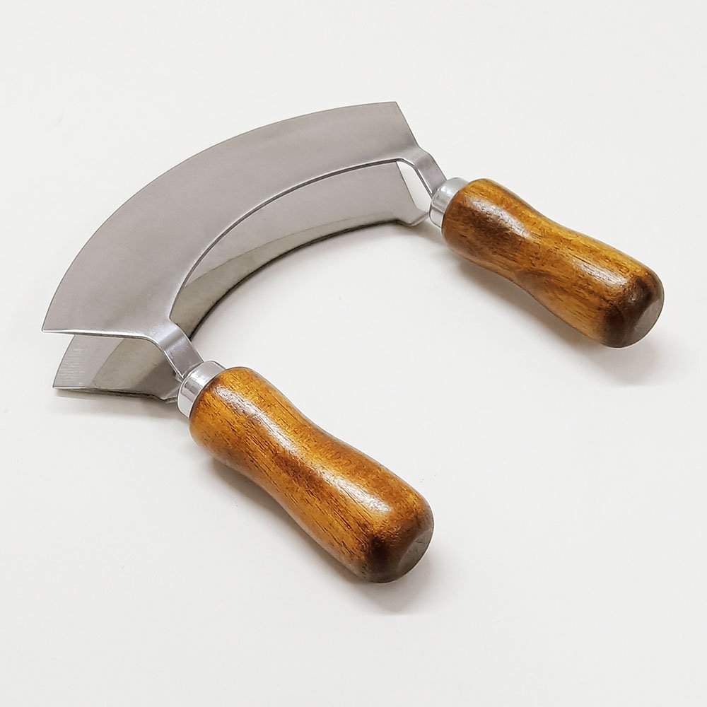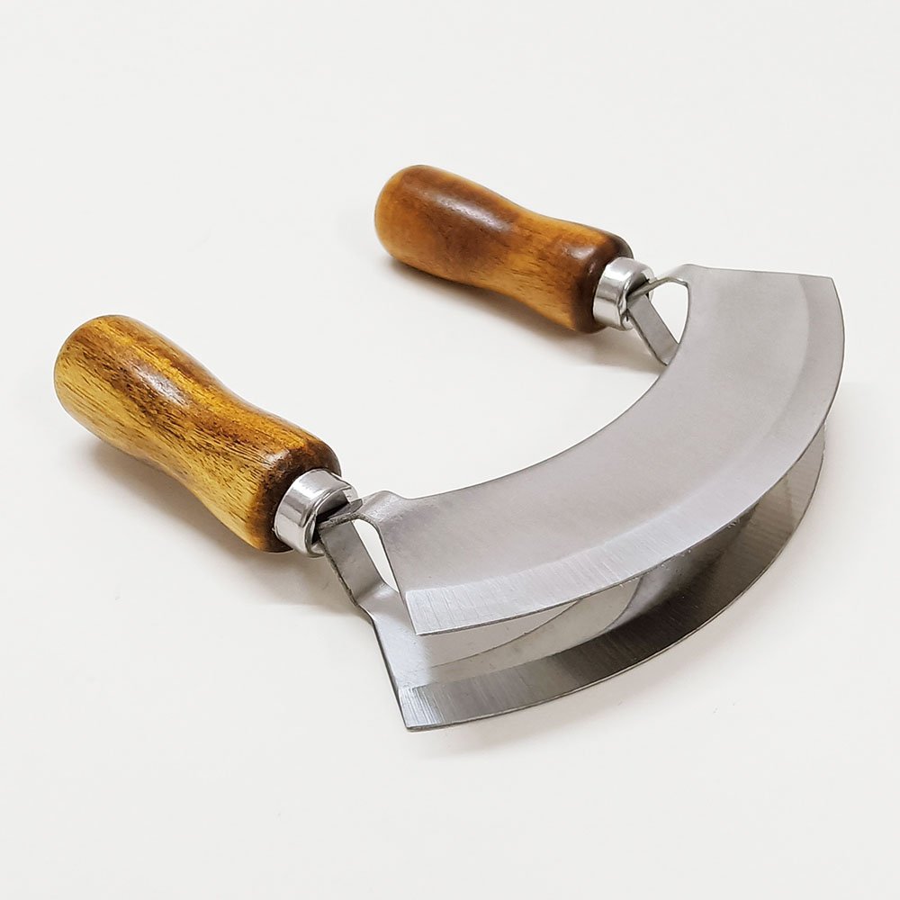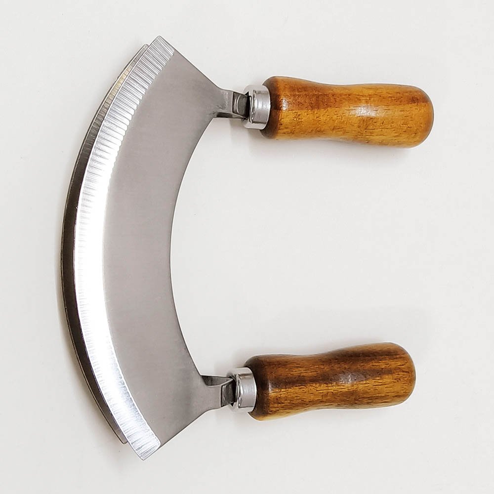 Durability meets aesthetic appeal with the 5.4 Inch Mezzaluna Knife. Boasting smooth surfaces and sharp double blades, this knife cuts through food effortlessly. The stainless steel material promises long-lasting sharpness, while the wooden handle ensures a comfortable grip during extensive use.