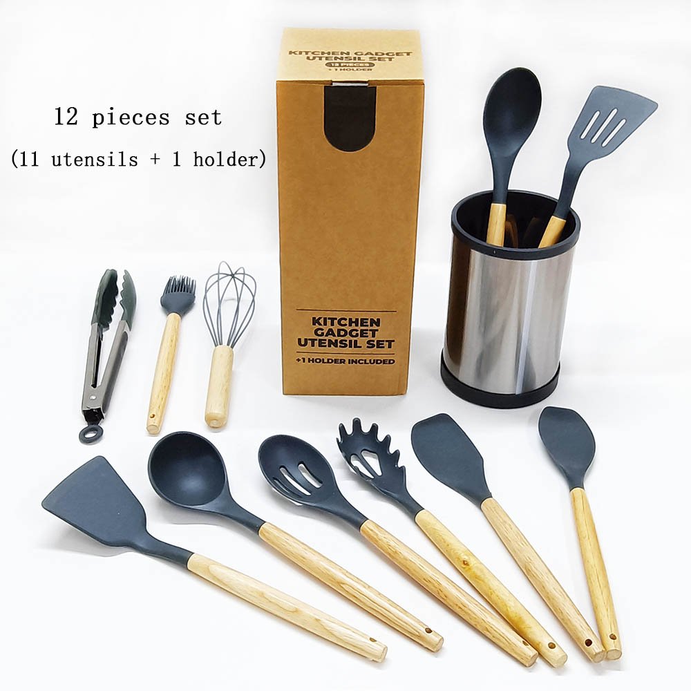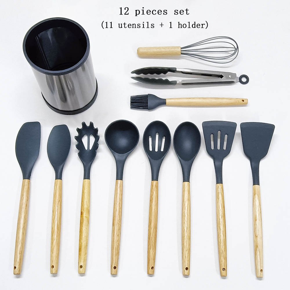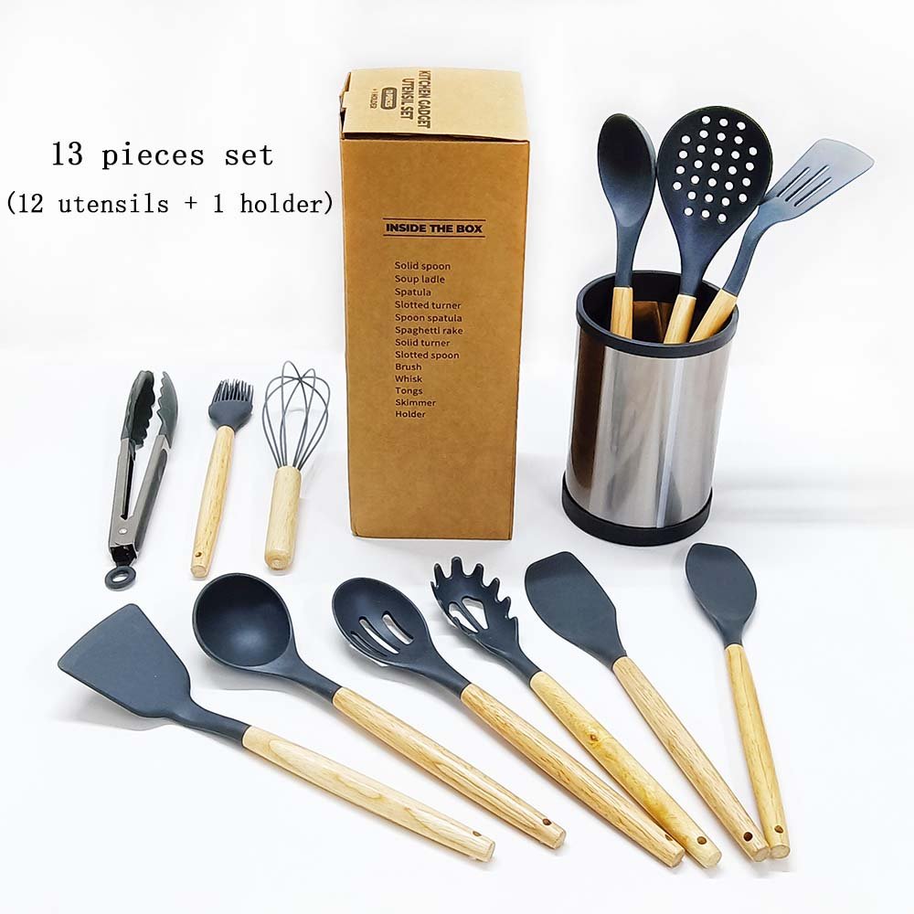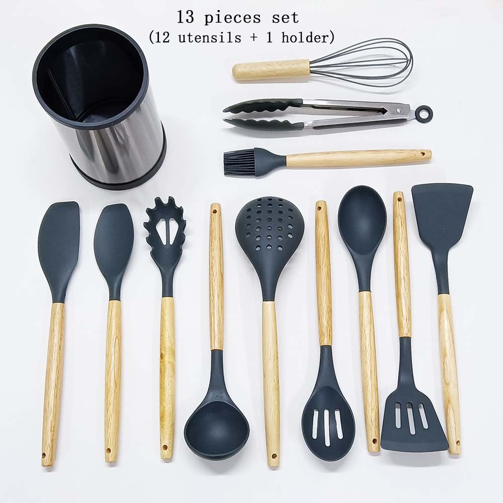 12/13-Piece Premium Silicone Cooking Utensil Set with Wooden Handles & Stainless Steel 360° Rotating Holder – Ultimate Kitchen Tool Collection