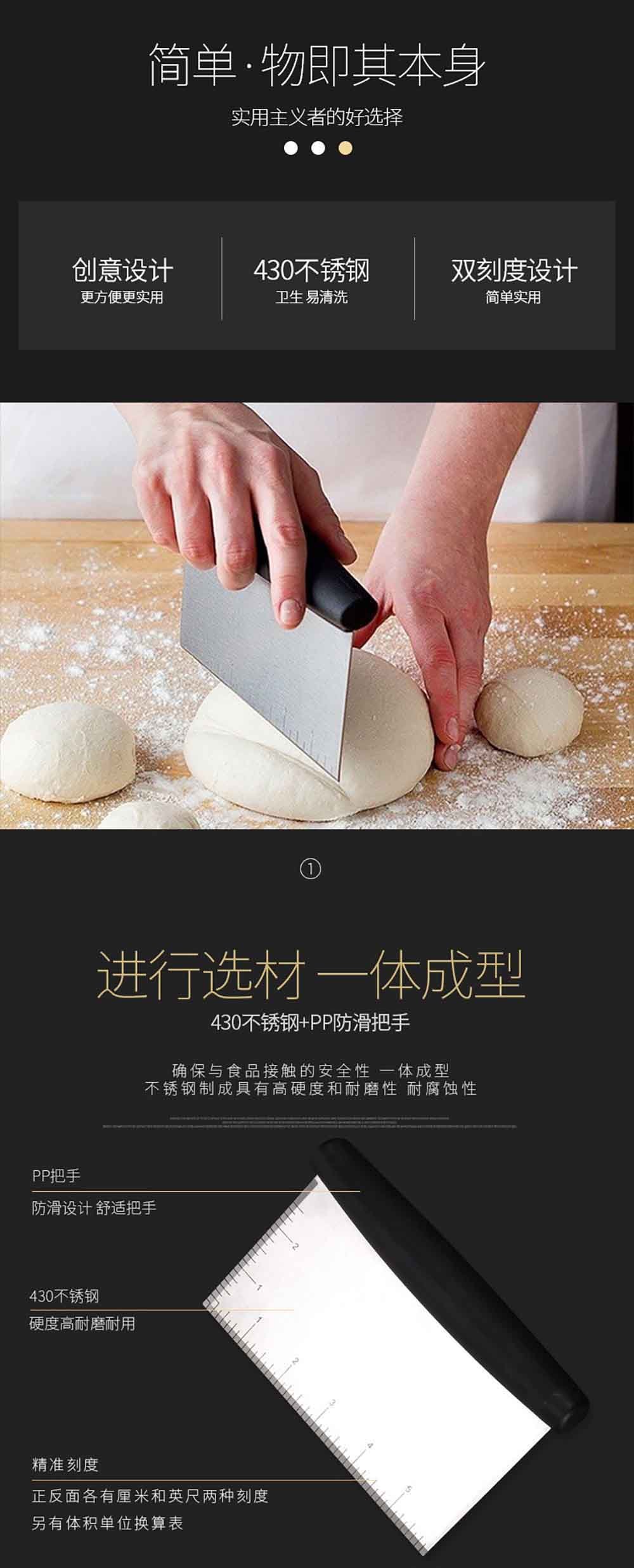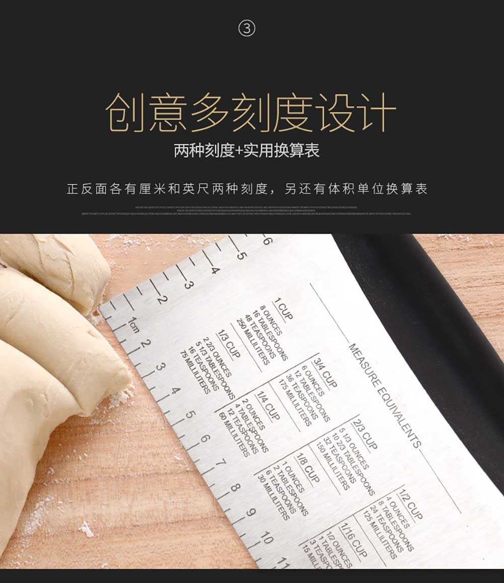 Never search for a ruler again. Both sides of the blade are etched with clear, permanent measurement markings in centimeters (cm) on one edge and inches (inch) on the other. An engraved volume unit conversion table is also included, making recipe adjustments and precise sizing effortless. Perfect for evenly dividing dough, measuring cut pieces, or checking pan sizes.