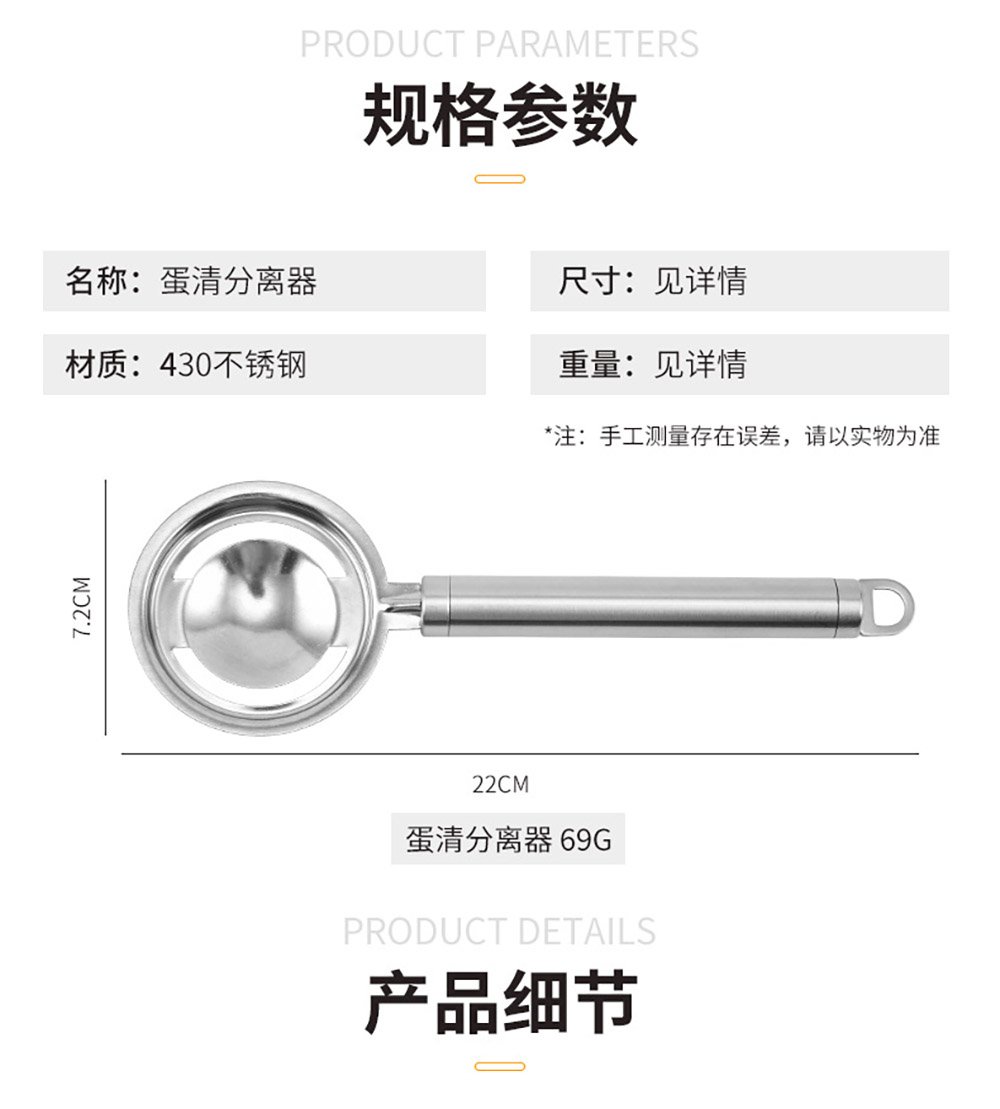Master your baking and cooking with precision and ease using this sleek and efficient Stainless Steel Egg Yolk Separator. Designed for both amateur cooks and seasoned bakers, this simple yet ingenious tool takes the mess and guesswork out of separating egg whites from yolks. Its dual-slot, perforated design and comfortable handle allow you to achieve perfect separation in just three seconds, ensuring your meringues rise higher, your custards become smoother, and your cakes turn out flawless every time. Crafted from durable, easy-clean 430 stainless steel with a mirror-polish finish, it’s as beautiful as it is functional.