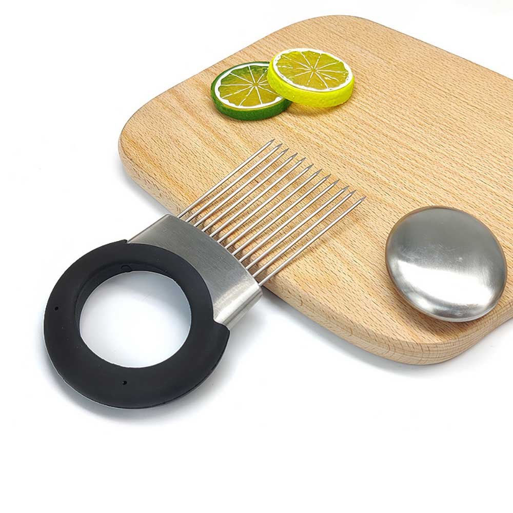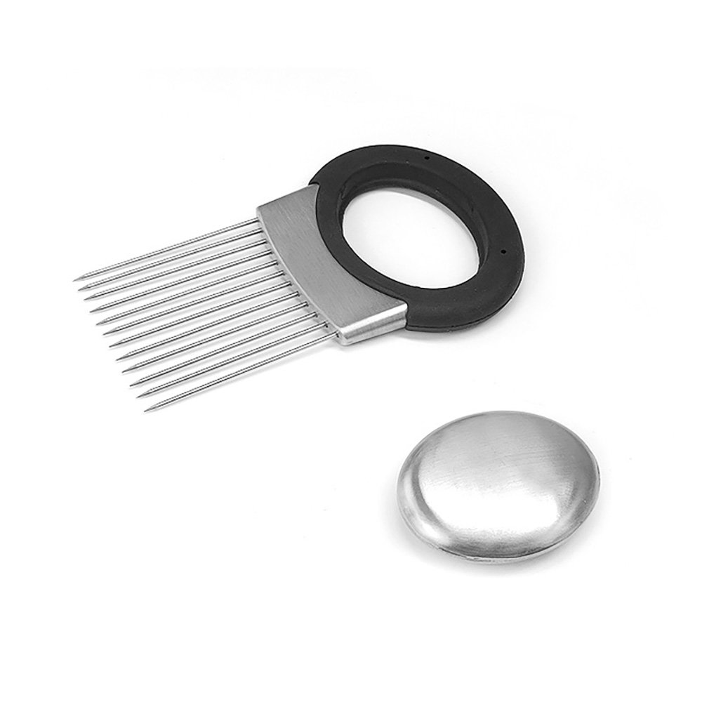 Stainless Steel Onion Holder with Deodorizing Soap – Kitchen Slicing Aid for Onions, Potatoes & Meat